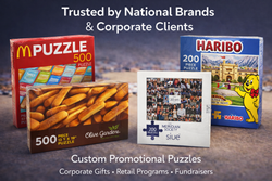 Premium custom jigsaw puzzle manufactured with high-density blue board for superior durability and tight interlocking fit. Fully custom printed puzzle and matching tuck box with full-color CMYK imprint. Retail-ready packaging. Ideal for promotional products, corporate gifts, branded giveaways, fundraising programs, museum gift shops, souvenir programs, and private label retail.